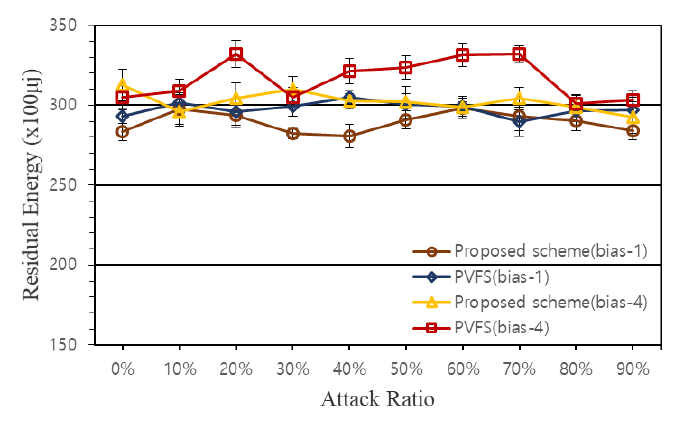 Fig. 14 shows a comparison of the residual energy averages of the surviving nodes in the proposed scheme and the PVFS in the region where there is no difference in the occurrence frequency of the events (bias-1) and the region with the greatest gap (bias-4). Regardless of the frequency of occurrence, we can see that the residual energy of the node in the field applying the proposed scheme is lower than that in the field using the original PVFS. There are two reasons for this. One is that the absolute energy usage in the proposed scheme is larger than that of PVFS. The other is that the proposed scheme saves nodes and performs energy management until the node reaches the end of its life. This means that our proposed scheme consumes more energy, so it is not suitable in a clean area where the attack rate is 0%. As shown in Fig. 12 and Fig. 13, the node survival rate and the report transmission success rate of the proposed scheme are higher than those of the original PVFS. Therefore, it is incorrect to assume the energy consumption in the proposed method is larger than that of the original PVFS.