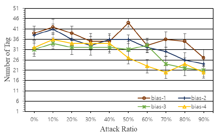 Fig. 15 shows the number of tagged nodes according to the attack rate when the total number of events is 1,000. In real situations, events may not occur evenly throughout the field, so the experiment using the proposed scheme considers a situation with a locally-biased event occurrence. The reason that the gap in the number of node tags according to these four deflected situations is not huge is because the proposed method considers the frequency of events as a fuzzy input and the node itself manages the routing list, as shown in Fig. 7. As the attack rate increases, the overall number of tagged nodes decreases. In a network environment where a security protocol is applied, when a false report attack occurs, most false reports are filtered within several hop movements. Therefore, when the total number of events is constant, the energy consumption of the whole network field decreases as the attack rate increases. Fig. 15 shows that the larger the regional deviation, the fewer the number of nodes that are tagged. Thus, the larger the attack rate, the larger the difference in the number of tagged nodes. Hence, the larger the regional variance, the more likely it is that there will be reduced energy consumption compared to earlier models. It is possible to improve the efficiency in the whole network by forming the routing through the nodes located in these high-attack locations. The reason why the peak point is shown when it is 50% of bias-1 in Fig. 15 is that bias-1 represents an ambiguous probability to separate an attack. Even when suspected as an attack, a node tag is selected to increase a node lifetime in the proposed scheme. We implemented this using fuzzy logic by considering the regional importance in the proposed method. We see that the proposed scheme has more effective load balancing in situations with a relatively low attack rate.