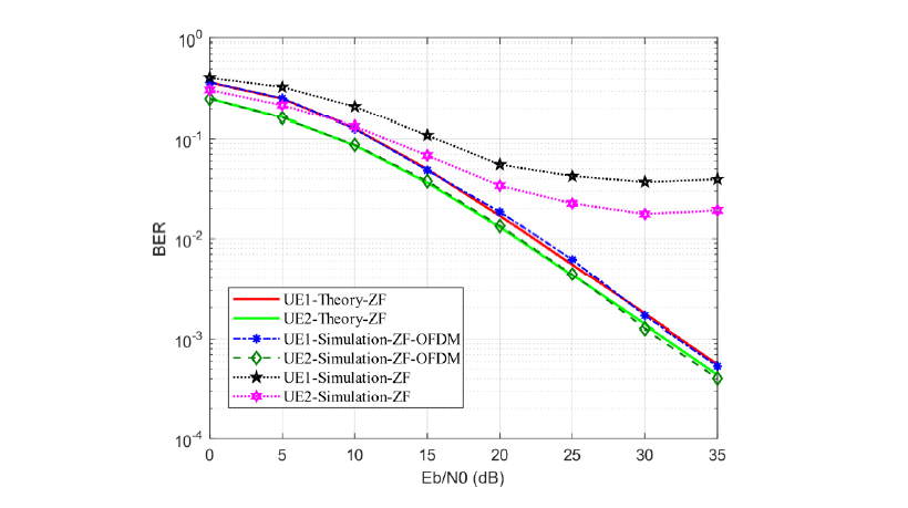 Figure 10. BER of two NOMA users in SISO-ZF-OFDM and SISO-ZF systems using MUST cat.1