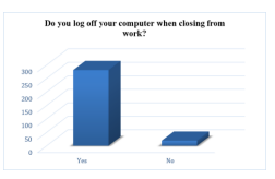 Figure 4-7 shows the results of UNAM employees who participated in the study. About 256 do not log off their computers when leaving work premises, and only 44 of the participants indicated that they log off their computers even when at their workplace. It has also been noted that around 295 UNAM employees hardly or do not log off their computers when attending a meeting. However, 5 of the participants indicated that they log off their computer even when attending a meeting. Similarly, 296 UNAM employees do not log off their computers when visiting a bathroom, and only 4 of the participants indicated that they log off their computers even when using a bathroom. Out of the total, 281 UNAM employees log off their computers when closing from work, and 19 of the participants indicated that they do not log off their computers when closing from work. These findings concur with the earlier findings by Evans et al. [16], who indicated that computers that are left idle and unattended might pose a threat to information. Hence, employees should not leave their computers unattended this could put sensitive or confidential information at risk of being leaked, exposed, or altered. Theft of devices accounts for 50% of security incidents; thus, undermining human error can cause major issues. For instance, if the system gets hacked, it may damage the integrity of the ITS system, which manages student information.