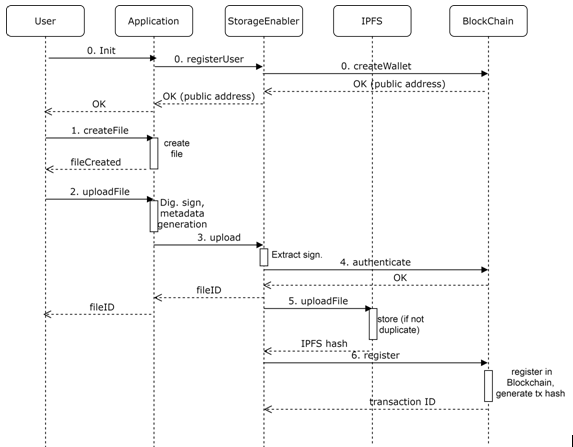 As depicted in figure 3, the user is initially registered on the Blockchain, so that a wallet and a public address are created (interaction 0). The user creates the content to be uploaded using the smart phone application, e.g., by taking a photo (1). The user instructs the mobile app to prepare and upload the message, including the Blockchain address of the sender and other optional parameters such as the timestamp and the location (2). The mobile app authenticates the user, calculates the MD5 hash of the message and the SHA3 256 hex string of the MD5 hash. It unlocks the Ethereum wallet of the user, asking for his password, and signs the Secure Hash Algorithm 3 (SHA3) hash with the private key of the user. It then locks the Ethereum wallet of the user and uploads the file to the Storage enabler (3).