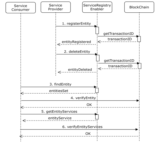 The inquiry interface is used when an entity is searching for entities and their services to consume. Initially, the service consumer searches for entities (3). The details of the entity can be verified (using the transaction ID) with the Blockchain (4). Then the consumer can ask for the services of a specific entity (5). n a similar manner, the service details can be verified with the Blockchain (6).