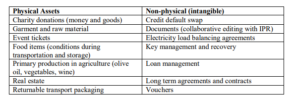 In the area of logistics, physical assets have been identified (e.g., returnable transport packaging) to facilitate their management and balancing procedures using smart contracts. Such smart contracts record the availability of the physical assets and the balance updates. In addition there have been applications focusing upon the transformation / digitalization Processes for transportation systems, including the management, the exchange, and the processing of transportation documentation (such as CMR documents). These are currently handled in a manual way (often involving mistakes and omissions). Another example has been the support of decentralized vehicle sharing with a community of drivers using Blockchains. In food supply, maintaining and monitoring, in a trustworthy manner, appropriate conditions in the storage and transport of sensitive and perishable products has been a well-known problem. Inappropriate temperature levels, poor air quality, humidity, light and other conditions have a negative impact on the delicate nature of foods. Blockchain has been used to track in near real-time the digital history of product, registering transport and storage events. Registered data can come from the IoT or be included manually.