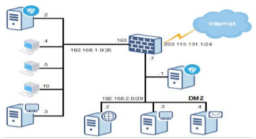The network access policy of this enterprise network can be seen in the network diagram: Only packets from the Internet are allowed to enter network zone 192.168.2.0/24, the enterprise network’s DMZ zone; packets from the Internet are not allowed to enter network zone 192.168.1.0/24, the user network area inside. Any traffic flow from the user network zone and the DMZ network zone, on the other hand, can reach the Internet. The cyber security administrator standardizes this policy into packet filtering laws, which are then created into the Package Filtering Rule Table (shown in the diagram) and installed on the firewall.