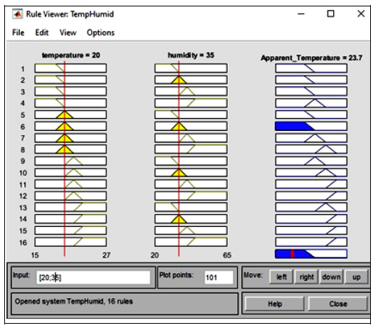 Figure 7 depicts an example of an indoor apparent temperature that is cool when the temperature is medium and the humidity is comfortable. Figure 8 depicts the 3D graphical representations of the defuzzifierin terms of indoor temperature, humidity, and output indoor apparent temperature.