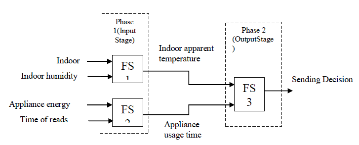 Therefore, the system configuration is shown in Figure 2 is adopted for building the fuzzy model to monitor the indoor area’s temperature and humidity, which affect the overall apparent temperature. Higher degrees of apparent temperature recorded are given more transmission importance than lower degrees to maintain the safety of the indoor monitored area. The Mamdani fuzzy inference system is used in our model to clarify expertise in a more natural and human-like manner. The fact that the Mamdani model has fuzzy output compared with other fuzzy inference systems, makes it quite expressive and interpretable compared with other models that have crisp output rather than fuzzy output such as Sugeno-type FS [29]. The proposed fuzzy model is divided into two phases that determine whether or not the indoor temperature and humidity readings should be sent to the control server room. Phase 1 serves as an input fuzzy stage and is made up of two fuzzy subsystems, FS1 and FS2. The first input fuzzy subsystem is represented by FS1. It functions as a bank of fuzzy if-then rules that relate three parameters: two input linguistic variables: indoor temperature and indoor humidity, and one output linguistic variable: apparent temperature. The second input fuzzy subsystem, on the other hand, is represented by FS2. It functions as a bank of fuzzy if-then rules that also connect three parameters: two input linguistic variables, appliance energy read and reading time, and one output linguistic variable: appliance time. Phase 2, the output fuzzy stage, is made up of one fuzzy subsystem FS3. FS3 acts as a bank of fuzzy if-then rules that relate three parameters: two inputs which are the outputs of FS1 and FS2 and one output, which is the final decision of the whole fuzzy logic model. Choosing the four inputs: temperature, humidity, appliance energy, time of reading is mainly since they are the main features that affect the decision of sending as follows: