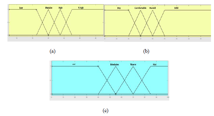 Figure 4. Membership functions of the parameters of FS1: (a) for temperature degrees,(b) for humidity degrees, and (c) for apparent temperature degrees