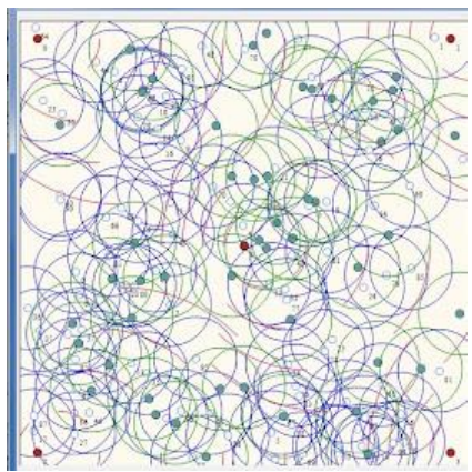 The constructed IoT network is estimated based on consideration of varying network scenarios such as small, medium, high, and very high. The establishment of a network is based on an adaption of memory, utilization of the network, and dynamic conditions of the network. Also, it involved in the estimation of unicast routes of data from source to destination based on LLNs with effective performance characteristics of the routing protocol to achieve characteristics performance of reduced overhead and delay. Additionally, it concentrated on the estimation of improving network performance through an increase in PDR and throughput. As a routing protocol, the routing process is based on consideration of on-demand and adopted in two phases such as control and discovery phases. In the first phase, the route for effective data transmission is created for data transmission between source to destination. In the second phase, it is estimated based on the threshold level with consideration of route or link failure, the establishment of the route for data transmission between nodes from source to destination. The message data utilized in the RPL routing protocol utilized for processing control packets those messages are Route Requests (RouteRQs), Route Replies (RouteRPs), and Route Errors (RouteERRs). Figure 2 presented the deployed IoT environment is illustrated. It defines the coverage range of 100 meters with the deployment of nodes. In the simulation platform, the established connection of the nodes is presented. Based on the created cluster nodes establish the connection between nodes.