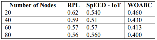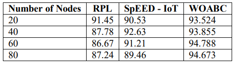 The performance of the proposed WOABC is comparatively examined with conventional RPL and SpEED – IoT. In table 4, the packet delivery function of the network is shown.