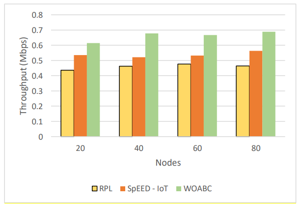 The comparative examination of throughput expressed that the proposed WOABC exhibits higher performance than the other technique. The throughput of RPL and SpEED – IoT is minimal that the proposed WOABC.