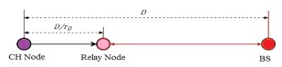 With the selection of CHs, to prevent higher energy depletion CHs are lies far away from the BS, the developed protocol elects the relay nodes for every node in such as wat the relay is utilized by the CH. In case if multiple CH uses the relay, then the assigned relay has different timeslots to handle communication between nodes with the decreased network throughput. Therefore, in the proposed model relay node uses the only one CH. This leads to lack of relay in CH and directly transmits the data to the BS. The relay node selection is based on the node distance from the BS with assignment of appropriate relay node and it proceeds the same procedure for every CHs. To select the appropriate node relay for CH two characteristics are considered i) reduction of the toral energy consumption and ii) energy consumption balance between CH and the relay. In figure 4 presented the hypothetical relay between CH and BS. The distance between BS and CH are partitioned as equal distance r0 with estimation of relay and BS distance.