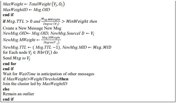 The field of TTL comprises of the small value integer those only constraints the originator node those uses similar TTL value. Every Vi node compute the value set denoted as TotalWeight(Vi,Ol). The defined values stated that the all-message weights are generated from the Oland reaches the destination node as Vi. Upon reception of the message Msg the recipient updates the Vi as TotalWeight function for the originator message. Every Vi evaluate the TTl message those are higher than 0. If Viperform data forwarding of messages between nodes. The recirculation is evaluated based on the recipient MWeight update in the TTL. The weight messages are classified based on the TTL degree as Vi those are decremented by the value 1. The message circulation halts are denoted as Vi in TTL as 0 or MWeight those are significantly minimal. Every node in the network receives multiple messages from the different data nodes. The computation performs the function of TotalWeight in the originators with the received messages. The nodes those receives the last message need to wait for few times to ensure high messages for processing. Then the node involved in the formulation of the originator for the value of maximal TotalWeight. To construct a particular cluster the messages are originator with the informing decision based on the node-ID. In case if all nodes lie below TotalWeight values than the node remains the outlier. The node those are joined in the cluster are decided and remain in the discover outlier at any point instances. It involved in accumulated weights form the different originator messages. In those cases, the nodes already in cluster are within the group the originator cluster make decision about the cluster. It involved in transmission of new messages in the originator to notify the decision about the cluster.