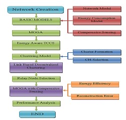 The proposed method is sub divided into four main sections namely Network basic models, Multi objective Generic Algorithm (MOGA), Clustering Module with decentralized Structure and Relay Node Selection. Multi-objective GA consist of energy efficiency calculation and reconstruction error parameters. Finally, MOGA based Compressive Sensing with Performance analysis. The network basic model consists of network model, energy consumption model and compressive sensing. With Genetic Algorithm Multi-Objective concept is combined in MOGA. Clustering involves the construction of clusters, choosing cluster leaders, and using a decentralized method with relay node selection. The suggested technique architecture is shown in figure 1.