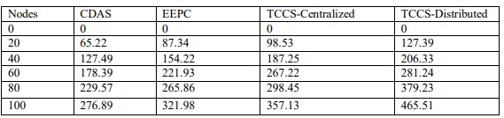 Energy efficiency defines the amount of energy remains in the network upon the transmission of data in the network. As WSN environment comprises of the higher node mobility and energy consumption level to improve energy efficiency of the WSN network proposed TCCSDistributed model uses the optimization model. In table 4 the performance of the proposed TCCS-Distributed model is compared with the CDAS, EEPC and TCCS-Centralized.