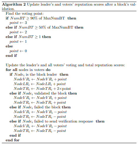 Algorithm 2 updates the block leader’s and voters’ reputation scores after a block is validated.