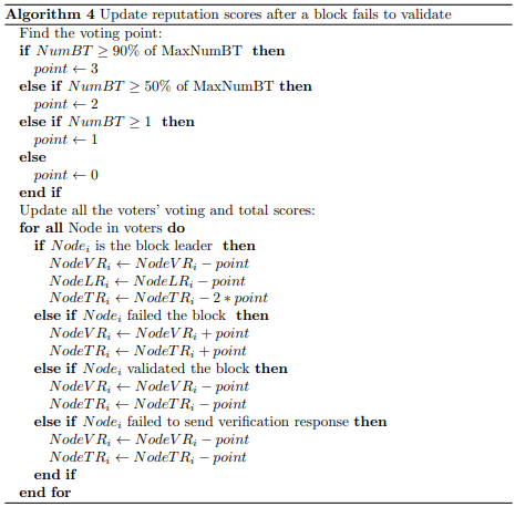 Algorithm 4 updates the block leader’s and voters’ reputation scores when a block fails to validate.