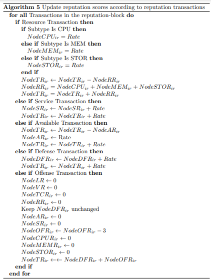 Algorithm 5 will run after a block is validated and will update all nodes’ reputation according to the reputation transactions in the reputation block. The transactions in the reputation block are sorted by timestamps before the update to ensure the correct chronological order of transaction creation.