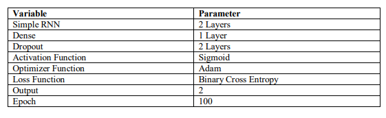c) RNN is Recurrent neural networks are also considered one of the simple neural networks, also considered a powerful type developed in the eighties. The most important thing that distinguishes this type and makes it a strong type is that it contains the internal memory we try in RNN used a little layer to train the classifier fast. Table 3 shows the architecture of RNN.