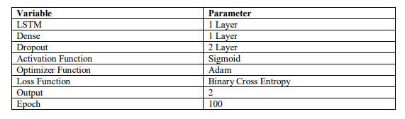 d) LSTM is Long short-term memory is one of the types of a type of RNN. It came to address several problems that the RNN suffers from. LSTM has the feature of retaining data and information stored for an extended period. Table 5 shows the architecture of LSTM.