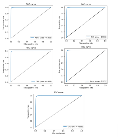 ROC Curve is also an important metrics evaluation based on the sensitivity and specificity when measuring for each classifier. It can be seen that the CNN and DNN classifiers harvest similar results, and the LSTM, RNN classifiers also achievement similar results as shown in the Figure 4.