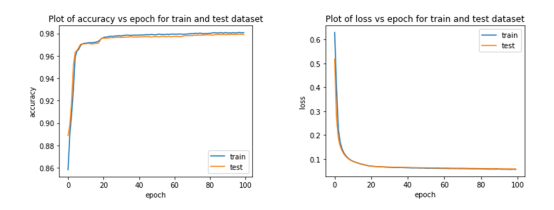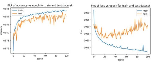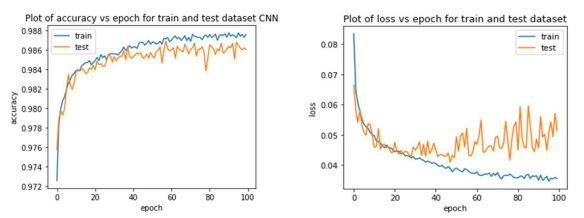 CNN classifier is reaching the best accuracy in epoch 98 and best loss. As shown in figure 6. Also, we can see in loss plot that need some enhancement and adjusting for classifier due some wide between the training and testing that happen.