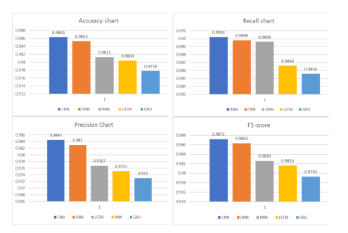 The goal of our approach is to try to get the best results for several metrics. The approach was made and implemented using the Python 3.5.6 programming language, also using (TensorFlow, Keras) with (NumPy, Pandas) library for preprocessing. The computer Hardware configuration is (Intel i7-2720 QM, 16 GB of RAM, AMD Radeon 2 GB, 256 GB SSD). Comparing the results of the deep learning classifier with the accuracy metric shows that the CNN classifier achieves the highest results, followed by the DNN classifier, as shown in the Figure 2. When it comes to Precision metrics, CNN is the highest, followed by DNN. The RNN classifier harvest highest result in recall metrics, followed by CNN. Finally, the F1-score metrics that produced the highest result are the CNN classifier followed by the DNN, as shown in Figure 2 and Table 9.