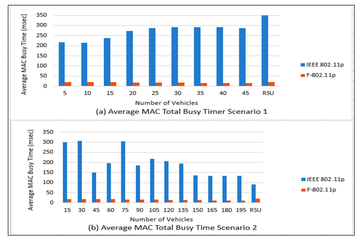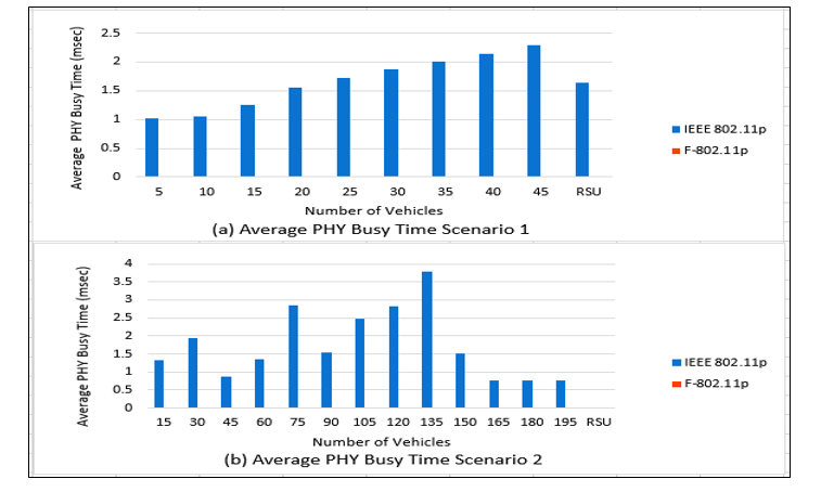 Busy time of MAC and Physical layers: A vehicle considers a channel idle if the summation of MAC busy time and PHY busy time is idle. The total busy time measures how many seconds the MAC layer treated the channel as busy, while busy time is a PHY layer measure that increases for each frame received above a sensitivity threshold. Figures 6 and 7 show both scenarios’ total busy time and busy time. A vehicle drops a packet(s) when it has an out speed normalized range (SL or Fa) and out sender/receiver gain normalized range (M) when using F-802.11p. Thus, the F-802.11p limits the number of processed packets in MAC and PHY layers. However, vehicles in a dense vehicle network satisfy the model constraints as in Figure 6 (b), so they take some time to process the packets. Due to their small numbers, the PHY is processes-free, as illustrated in Figure 7 (b). Therefore, the PHY busy time and the MAC total busy time are reduced consequently, and the F-802.11p outperforms the standard IEEE 802.11p.