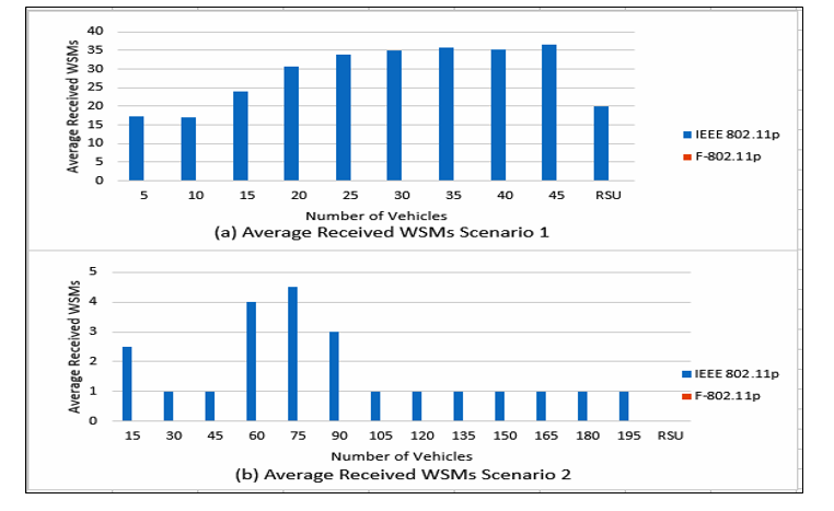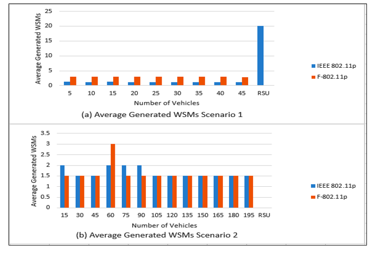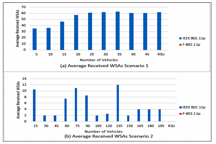 Figure 8 (a) shows that the number of WSMs created by IEEE 802.11p is less than those produced by F-802.11p. However, both do not exceed five messages during the simulation interval. Controlling the MAC and PHY layer when transmitting packets drops packets until vehicle(s) is under speed and sender/receiver gain allowed ranges when using F-802.11p requires additional effort to broadcast messages. Therefore, IEEE 802.11p outperforms F-802.11p in a low-dense network. However, RSU creates multiple WSMs in case of using IEEE 802.11p more than those using F-802.11p. Figure 8 (b) contains a dense vehicle network, the performance of F-802.11p is almost similar to IEEE 802.11p except in some vehicles (15, 75, 90). F-802.11p creates no messages due to the organizing of speed and sender/receiver gain allowed range; vehicles have no changes in their states. In contrast, the organizing has a trade-off as in vehicles (60) that requires more messages.