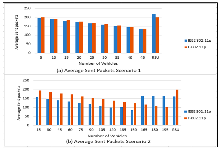 Sent packets: Sent packets (SP) include packets sent during message dissemination, generated WSMs, WSAs, and BSMs. Figure 11 shows the SP for both scenarios. The SP using F-802.11p is greater than the IEEE 802.11p due to fuzzy model controls vehicle transmitting packets with speed (10-27.78) for the first scenario and speed for the second scenario (13-27.78). However, RSU in Figure 11 (a) and vehicles (165, 180, 195) in Figure 11 (b) that use the IEEE 802.11p need additional packets because of the increasing time for backoff when sensing a channel busy.