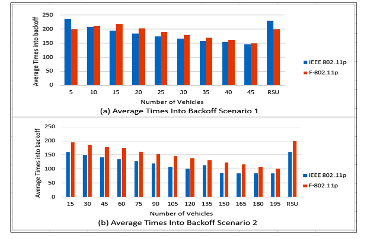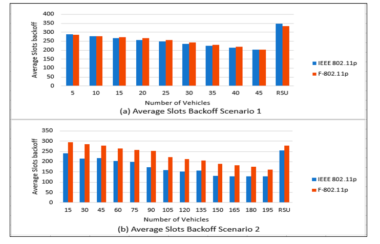 Time into backoff: Time into backoff is the number of times the vehicle is in backoff. Slots backoff is the number of slots due to backoff. Time into backoff and slots backoff has a strong positive correlation with CSMA/CA MAC protocol as they express how often a channel sensed busy. Figures 16 and 17 show the time into backoff and slots backoff for both scenarios. In Figure 16 (a), and due to F-802.11p limitations, vehicles are not satisfying the conditions of the fuzzy model while they sense a channel idle. Therefore, they require several backoff times more than traditional IEEE 802.11p. Vehicles (15) and RSU get into backoff when using IEEE 802.11p because a channel is sensed busy. Generally, F-802.11p acts as IEEE 802.11p in times into backoff. The behavior of F-802.11p and IEEE 802.11p in Figure 16 (a) is similar to that in Figure 16 (b).