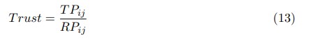 Trust metric: Trust is a primary cost value for routing via an IoT-based WSN, and has been used to increase security against malicious nodes. The mobile nodes in an IoT-based WSN interact with one another by relying on the mutual trust established between the nodes over time. Direct trust is a packet-forwarding behavior that is based on the fraction of data (transferred) (T Pij ) and the amount of data packets (received) (RPij ) . The direct trust degree is calculated based on the following equation (13).
