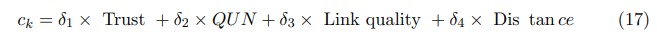 0.35, 0.25, 0.25 and 0.15 are the weighted mean for δ1, δ2, δ3, and δ4 correspondingly. The malicious nodes that generate packet drops are avoided using the trust metric when designing the transmission path. Following that, to generate a route with less traffic, the QUN and link quality are taken into account in the cost measure. This reduces the chance of a communication collision and improves packet delivery. In addition, the shortest distance is determined to reduce the nodes’ energy usage.