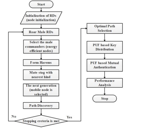 The functionalities of each step and its requirements including CH selection, Fitness function metrics, route selection, PUF structure, Key distribution, Authentication and security along with flowchart for proposed RDA-PUF is explained clearly in the below sections.