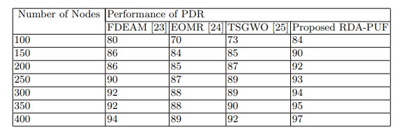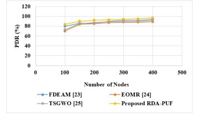FDEAM [23], EOMR [24], and TSGWO [25], because as the node count rises, extra nodes begin steering packets indiscriminately, and there is a higher chance that a node may expire at some point. Only the optimal node is assigned to transfer packets in the RDAPUF approach, resulting in increased battery life and network longevity. The comparative examination of Packet Delivery Ratio performance is tabulated in Table 5. It displays that, when compared to conventional methods, the suggested RDA-PUF increases the network lifetime.