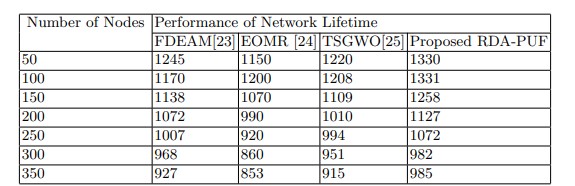 Figure 7 shows comparative analysis of network lifetime amongst the proposed RDA-PUF and the conventional methodologies. In RDA-PUF, there is a longer lifespan than existing