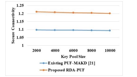 The possibility that two individuals can generate a session key to secure communications is characterized as a network’s security connectivity. By considering ”intra-cluster secure connectivity” a bilateral password is created in the network by a cluster-member, because this study primarily presents a method for intra-cluster authentication and key distribution. The effectiveness of secure connectivity is shown in Figure 8. The probability of sharing a key grows as the amount of preloaded keys increases, as seen in Figure 8. As
