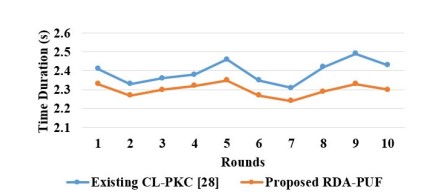 9 displays the time duration performances of existing CL-PKC [28] and proposed RDAPUF protocol. From the figure 9, it clearly shows that proposed RDA-PUF achieves mutual authentication and key exchange in short interval of time. Table 7 shows the comparative analysis of time duration.