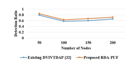 The detected data is encrypted using a shared symmetric key in this technique. The combined result is sent to the sink, where it is double-checked. For the sensed findings, this procedure is iterated by every sensor. Figure 10 shows the data integrity performance through detection ratio. From the figure 10, it clearly shows that proposed RDA-PUF achieves higher detection ratio when compared to existing Data Validation and Integrity Verification for Trust Based Data Aggregation (DVIVTDAP) [32]. By examining the simulation results, it is indicates that the best method improves data accuracy.