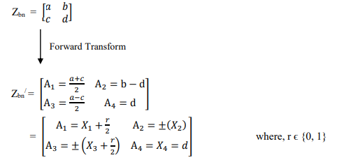 Let sub matrix of a region is Zbn=[ei], where ei ϵ{0,1,.,255} is the pixel byte value for matrix element index i ϵ{1,2,3,4} and bn ϵ{1,..,N} is the matrix number. For signature bit encoding, the forward and reverse transformation of Zbn is given as-