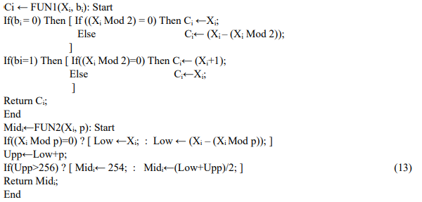 Two functions FUN1(Xi, bi) and FUN2(Xi, p) are defined to code the bit bi ϵ{0,1} on corresponding transformed positive integer component of Xi, for i ϵ{1,2,3,4}. ‘FUN2’ directly returns the concerned coded value Ciϵ{0,±1..,±255}, whereas ‘FUN2’ returns the positive threshold reference point Midiϵ{0,1,..,255} in between the lowest (Low) and upper (Upp) multiple number of ‘p’ with regard to Xi. This point is then used for threshold value based bit coding with suitable signs, and the following is the step-by-step process for bit casting.