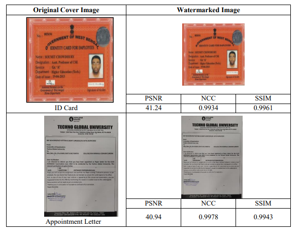 This proposed scheme is extensively tested with color cover images of size 512 x 512 and the signature images of size 32×32 or 64×64. Critically, all these images are taken in PPM format and the signature embedding and extraction algorithm implemented through C language under the LINUX platform while the simulation results related to image similarity traced through MATLAB software (R2018a) [20, 24]. The effectiveness of this scheme further judged from different angles in terms of data hiding imperceptibility and robustness with common standard image similarity parameters like Peak Signal to Noise Ratio [i.e PSNR with its unit in decibel (dB)], Structural Similarity Index Measurement [i.e SSIM with its value ranges between –1(mostly dissimilar) to +1(exactly similar))] and Correlation Coefficient [i.e CC with its value ranges between – 1(mostly dissimilar) to +1(exactly similar)] [10-17]. In this aspect, at first Table 1 reflects identical visual qualities of the original and signature casted watermarked e-doument images with good PSNR, SSIM and CC values while Table 2 shows the signatures and respective shars used for embedding. Hence, Table 1 clearly highlights that the shown watermarked images are mostly free form any visual or statistical attacks while they reflect superb data hiding imperceptibility as well.