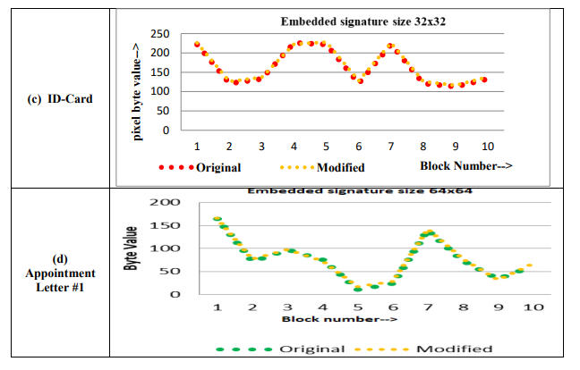 Apart from using these common standard methods, the noise injection due to signature embedding within the watermarked image is further evaluated through pixel byte value deviations line graph as reflected in Table 5. Here in case (a) and (b) respective pixel byte position values are plotted for the original and watermarked images considering certain periodical interval of pixel byte positions. Additionally, another line graph pairs in (c) and (d) is also shown by taking into account the average of respective block pixel byte values for both the original and watermarked image.