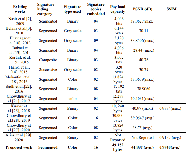 Further assessment on data hiding invisibility is also explored by way of an exhaustive comparative study with the existing concepts where the proposed work highlights significant enhancements from different angles especially 1-3% minimum growth of PSNR under much higher data pay load hiding. This comparison is shown in Table 7 where the proposed idea mostly reflects 2-3 times higher pay load embedding and superior PSNR for colour cover and signature images both in contrast to the other works.