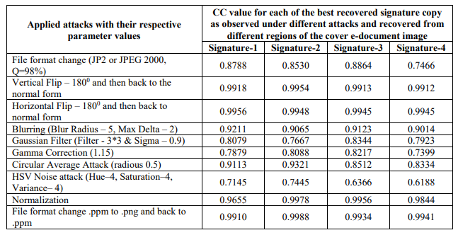 To proceed further with the successful implementation of this scheme, the hidden signature extraction or recovery aspects is now focused where at first Table 8 reflects exact identical signature recovery by merging the respective public share and the extracted private share of the concern signature. Critically all these attack related tests were carried out on the watermarked ID-Card image and after extraction of attack affected signatures form the attacked watermarked image, they were matched with their respective original form to judge the concern quality. If due to attack affects signature bit coded altered pixel byte value stays within the applicable valid range, then the correct signature bit will be sensed form that particular pixel byte value. Further, this proposed idea also adopts multi-copy signature embedding which actually promotes quality wise best signature copy sensing from all those attacks affected extracted signature copies. Hence, this proposed algorithm aims to serve strong robustness thatis reasonable recovery of signatures under various attacks and this is clearly judged from the following tables of 9, 10 and11. Among these, Table 9 shows the matching CC value for each of the best signature copy recovered against the corresponding attack. After that, Table 10 presents the average CC value of all the four best recovered signatures against a particular attack and this value looks superior in contrast to the other related works showing the similar scenario. Finally, at last Table 11 highlights a comparison where the proposed concept visualizes cent percent good quality (CC > 0.7) signature recoery against numerous attacks and this scenario is either at par or much better in contrast to the other related works.