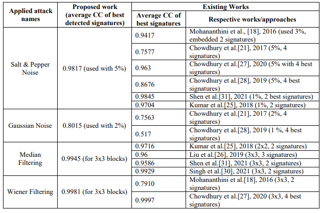 Table 10. Average CC value comparison for detected signatures with the existing works under attacks