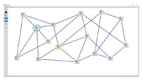 Fig. 5. The node circled in green (s3) is the controller according to GPA. The node circled in yellow (s13) is the position chosen by the K-Median algorithm