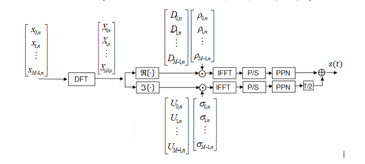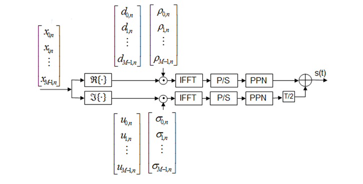 Assume M subcarriers and N symbols; as shown in figure 1, the nth complex input symbol at mth subcarrier xm,n is represented by in-phase and quadrature components indicated by dm,n and um,n respectively as shown below: