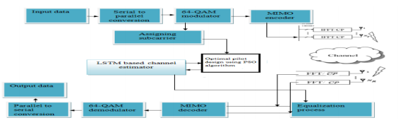 The input data is first passed to a converter block, which converts serial data to parallel data. The data is then passed via a 64-QAM block, which uses a single radio wave to indicate six bits of data by altering parallel data, where K symbols form a modulated data block [24]. A MIMO encoder/decoder block is shown, with a prefix included to counteracting multipath fading. The modulator is linked to the sub carrier block, which comprises of numerous pilot blocks. The Particle swarm optimization approach is used to identify the best pilot. The input for PSO is set of pilot signals coming from a 64-QAM modulators [25]. The optimal pilot signals are given to the LSTM network for efficient channel estimation as shown in figure-2. The optimal pilot signals can be denoted as {opt(pi1),opt(pi2),…..opt(pin)} which is the input for LSTM.