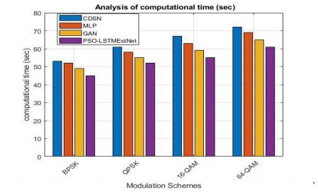 The analysis of computational time between PSO-LSTMEstNet and various networks such as Convolutional Deep Stacking Network (CDSN), Multi-layered perceptron (MLP) neural network, and Generative Adversarial Network (GAN) is depicted in figure 6. Various modulation schemes are taken into consideration for comparison that includes BPSK, QPSK, 16-QAM and 64-QAM. From the observation based on simulated findings, the computational time of PSO-LSTMEstNet is found to be minimal, the rest of the networks that were subjected to comparison. Thus, with reduced computational time which is a major feature, the PSO-LSTMEstNet is proved to be efficient.