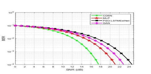 The comparative analysis of bit error rate, between suggested PSO-LSTMEstNet and various networks such as Convolutional Deep Stacking Network (CDSN), Multi-layered perceptron (MLP) neural network, Generative Adversarial Network (GAN) is performed. The various modulation techniques along with their corresponding SNR is taken into consideration for analysis. In order to observe the outcome of simulated findings, 64 QAM is fixed as a reference index. On an average, it is observed that BER of 10-2 is obtained at 10db.The above findings ensure that the suggested network is efficient.
